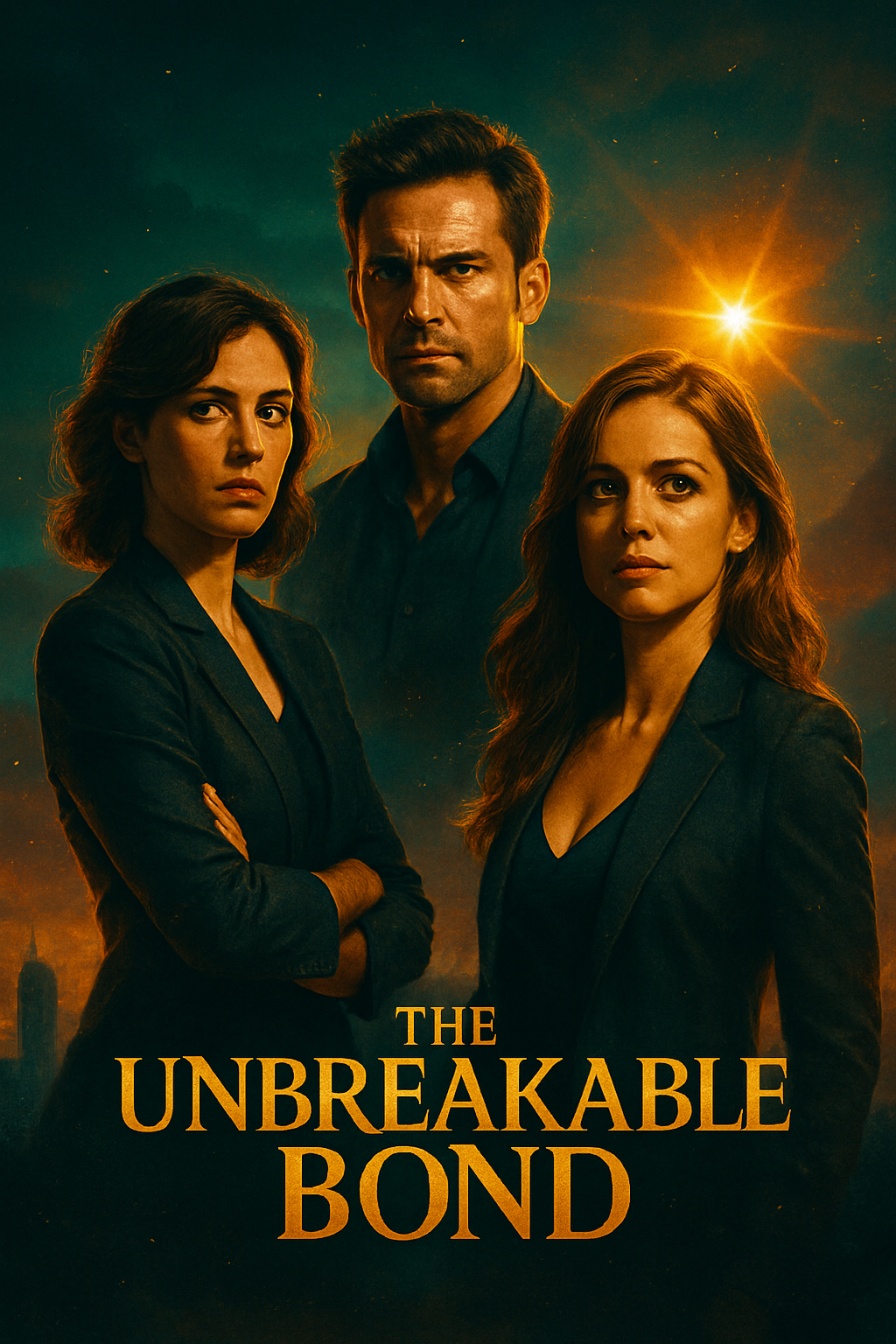 "The movie poster for 'The Unbreakable Bond' showcases three protagonists — two women and a man — standing powerfully against a fiery sunset backdrop with a glowing golden light framing the right woman's head. The city skyline fades into a cool blue, while the title, in bold, golden letters, anchors the dramatic composition of intense focus and contrasting lighting on the trio. Add cinematic lighting with lens flares, visible dust and particles in the air, deep shadows, and rich golden-orange and teal color grading for a classic action-movie atmosphe.